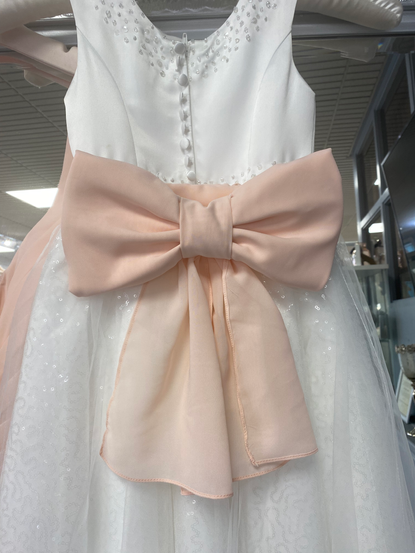 These adorable custom bows were my original design and they are created in a sustainable way. The colour of the flower girl bows are usually matching the bridesmaids, keeping this in mind I decided to use the chiffon shawls that come with the bridesmaid's dresses to create the bows so that the colour match is exact. Using these shawls I simply covered the original bows that come with the flower girl dresses and used all the same attachments from these original bows as well. No sewing machine is needed when creating these bows as the chiffon shawls are already pin-hemmed themselves leaving no raw edges. I am incredibly proud of this idea as it makes the flower girls become more cohesive with the rest of the bridal party and can be made with no wasted fabric and everything used is already accessible.