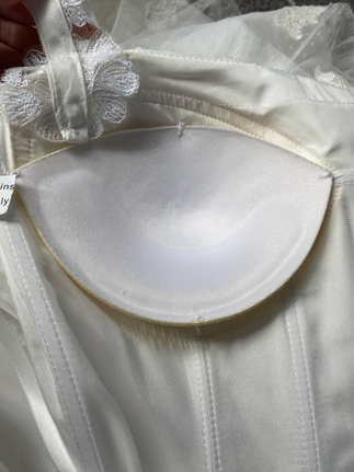 When it comes to the fitting the customer will be given the bust cups to place under their bust and the option of having either 1 or 2. If 2 bust cups are needed they are simply sewn on top of one another to create more padding. They are then sewn into the bust of the dress, making sure it follows the boning structure inside the gown, using a double thread they are sewn on either side and at the top. The cup will then be lifted leaving a small gap at the bottom so it is secured to the dress with a chain stitch.