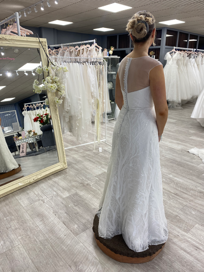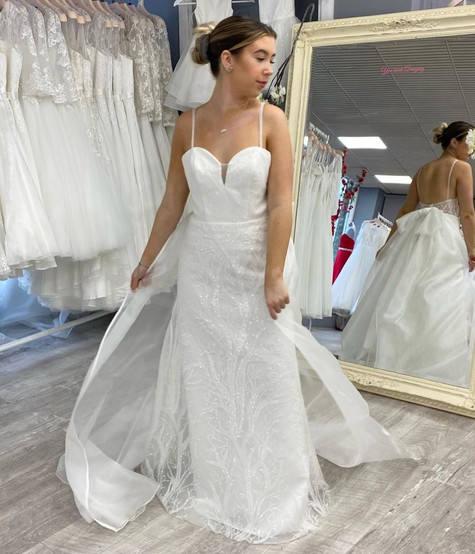 I started by gathering inspiration on Pinterest making a board full of wedding dresses that had different aspects that I wanted to add to my own design. I then started sketching out my design, and I wanted it to have distinct changes from the original dress, making it unique. Some of the more apparent changes I added were an illusion neckline, low back, and sheath skirt. Also, I made an accessory for my dress which was a detachable train and a bow. The detachable train could be attached by hooks and loops that I added and the bow was also removable by poppers. I was very happy with my design and it took two days (14 hours) to complete. It was a big accomplishment and my dress is now on the shop floor of the Brighouse store ready to be tried on and bought by customers.